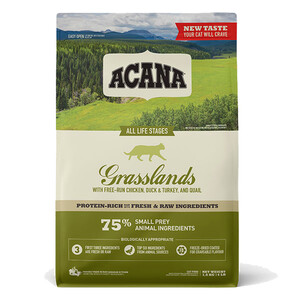 Рецептура ACANA Grasslands Cat розроблена з урахуванням природних потреб котів, які потребують високопротеїнових м'ясних раціонів. Вона включає м'ясо курчат та качки вільного вигулу, гніздові яйця, рибу, виловлену в дикій природі, а також м'ясо індички та перепілки. Завдяки концепції WholePrey, до складу входять м'ясо, органи, хрящі та кістки, що забезпечує вашого кота всіма необхідними нутрієнтами.