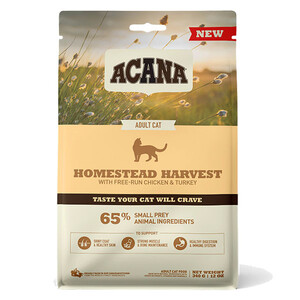 Годуйте свого кота раціоном, сповненим найкращими м'ясними інгредієнтами з ACANA Homestead Harvest. Цей раціон багатий на м'ясо курчат, вирощених на вільному вигулі, індичку та качку, представлених у співвідношенні WholePrey, що включає м'ясо птиці, органи та хрящі. Такий склад забезпечує природне харчування для вашого кота, а його неперевершений смак не залишить байдужим навіть найвибагливіших улюбленців. Забезпечте вашому коту здоров'я, щастя та силу кожного дня з раціоном ACANA.