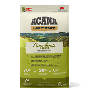 ACANA Grasslands Recipe — це високопротеїновий раціон, створений для собак всіх порід і всіх стадій життя. Збагачений м'ясними інгредієнтами (70%), такими як м'ясо ягнят, вирощених на ранчо, качка, яйця та озерна риба, і збалансований фруктами, овочами та травами (30%), цей корм забезпечує повноцінне харчування для вашого собаки. Кожен інгредієнт у складі корму має важливе значення і надходить щодня від перевірених фермерів і рибалок.