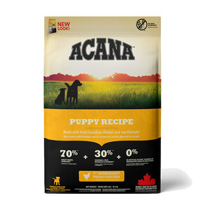 ACANA Puppy Recipe — це корм для цуценят, що містить 70% якісних м'ясних інгредієнтів і 30% фруктів, овочів та трав. Він забезпечує цуценя всіма необхідними нутрієнтами для швидкого зростання та розвитку.