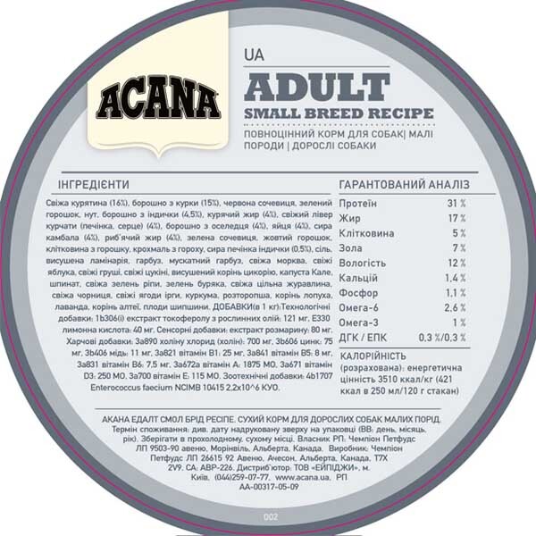 Рецептура корму ACANA Adult Small Breed Recipe містить 60% м'ясних інгредієнтів, таких як м'ясо курчат, індички, та сирої камбали, і 40% фруктів, овочів та трав. Корм забезпечує всі необхідні нутрієнти та протеїни для підтримки здоров'я дорослих собак малих порід.