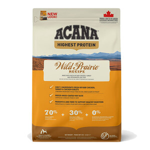 ACANA Wild Prairie Recipe — це корм для собак всіх порід та стадій життя, створений із особливою турботою з преміальних інгредієнтів. Ця рецептура належить до лінійки ACANA Highest Protein, що відрізняється найвищим вмістом м'ясних інгредієнтів серед формул ACANA для собак. Раціон містить 70% якісних м'ясних інгредієнтів, таких як м'ясо курчат і індички, а також рибу, виловлену в дикій природі та вирощену на фермах з дотриманням екологічних умов. На 30% раціон збалансований фруктами, овочами та травами, всі інгредієнти доставляються на кухні щоденно.