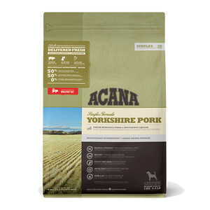 ACANA Yorkshire Pork – це раціон з обмеженою кількістю інгредієнтів, де м'ясо канадської свині (50%) є єдиним джерелом легкоперетравних протеїнів. Цей корм ідеально підходить для собак з чутливим травленням.