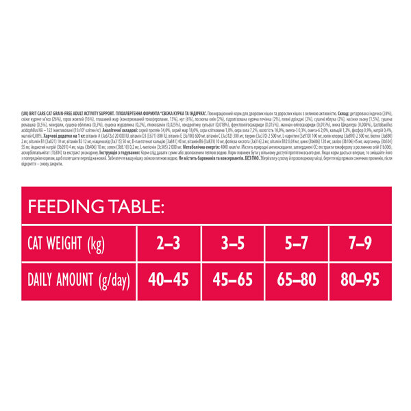 Brit Care GF Adult Activity Support Fresh Chicken & Turkey - гіпоалергенна формула зі свіжою куркою та індичкою для вуличних і дорослих котів з високим рівнем активності. Корм сприяє здоров'ю травного тракту та контролю ваги завдяки пробіотикам і пребіотикам, які сприяють росту здорових бактерій у кишечнику та регулюють обмінні процеси. Розчинна і нерозчинна клітковина допомагає підтримувати оптимальну вагу. Поєднання свіжої курки і високоякісної індички робить смак та аромат корму привабливим навіть для найвибагливіших котів. Високоякісний м'ясний білок допомагає підтримувати хорошу м'язову масу. Хондропротектори підтримують здоров'я зубів, суглобів і кісток для щоденного полювання та ігор. Фрукти, трави і ягоди, багаті на вітаміни та флавоноїди, підтримують активність і добре самопочуття кота.
