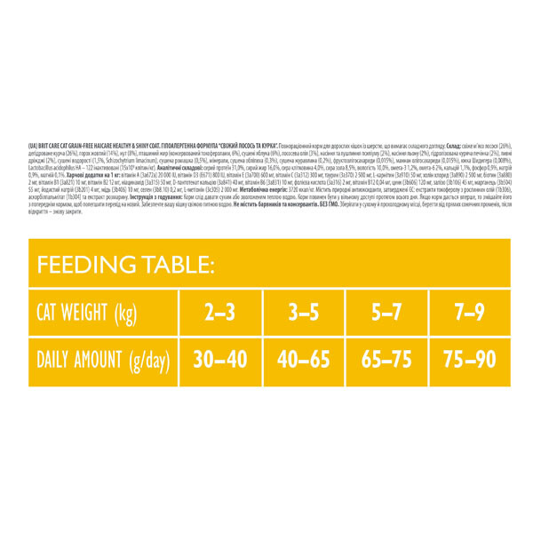 Brit Care GF Haircare Healthy & Shiny Coat Fresh Salmon & Chicken - гіпоалергенна рецептура зі свіжим лососем та куркою для дорослих котів з довгою шерстю або вимогливим доглядом за шерстю. Корм Brit Care Cat GF Haircare Healthy & Shiny Coat допомагає підтримувати здоров'я шерсті завдяки високоякісним м'ясним білкам, омега-3 і омега-6 жирним кислотам. Таурин, важлива поживна речовина для котів, сприяє гарному зору і здоров'ю серця. Поєднання свіжого лосося і високоякісної курки робить смак та аромат корму привабливим навіть для найвибагливіших котів. Натуральні джерела жирних кислот (лосось і масло лосося, курка, лляне насіння, водорості) допомагають підтримувати здорову шкіру та красиву, блискучу шерсть, зміцнюючи її, скорочуючи линяння і зменшуючи сухість та лупу.