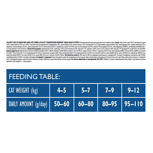 Brit Care GF Large Сats Power & Vitality Fresh Duck & Chicken - гіпоалергенна рецептура зі свіжою качкою і куркою для дорослих котів великих порід. Корм забезпечує довголіття і здоров’я вашого котика завдяки фруктам, травам і ягодам, багатим на вітаміни та флавоноїди. Натуральні джерела жирних кислот омега-3 та омега-6 сприяють блиску шерсті і здоров'ю шкіри. Високоякісний м'ясний білок допомагає підтримувати хорошу м'язову масу, а таурин сприяє гарному зору і здоров'ю серця. Хондропротектори підтримують здоров'я зубів, суглобів і кісток. Пробіотики та пребіотики сприяють росту здорових бактерій у кишечнику та регулюють обмінні процеси, допомагаючи підтримувати оптимальну вагу.