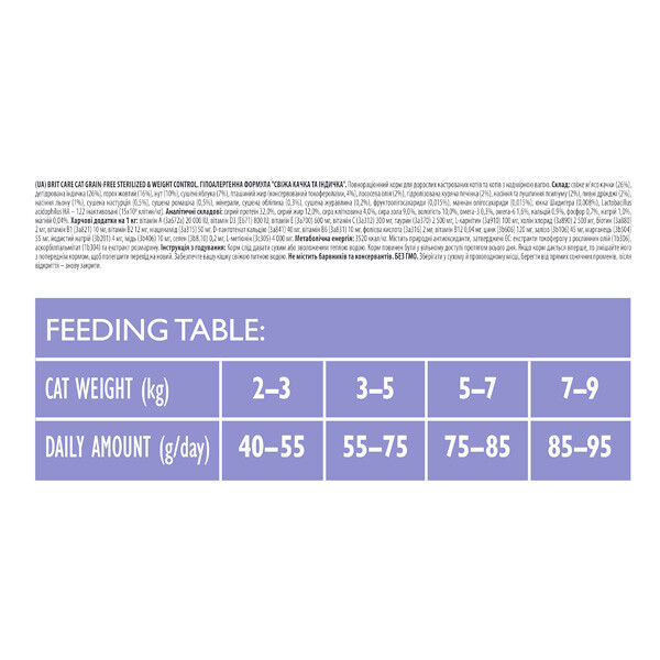 Brit Care GF Sterilized Weight Control Fresh Duck & Turkey - гіпоалергенна рецептура зі свіжою качкою та індичкою для дорослих стерилізованих котів і котів із надмірною вагою. Корм забезпечує високоякісний м'ясний білок, який допомагає підтримувати хорошу м'язову масу. У поєднанні з таурином він сприяє гарному зору і здоров'ю серця. Фрукти, трави і ягоди, багаті на вітаміни та флавоноїди, забезпечують довголіття та здоров'я вашого кота. Пробіотики та пребіотики сприяють росту здорових бактерій у кишечнику та регулюють обмінні процеси, допомагаючи підтримувати оптимальну вагу. Свіжа качка є дієтичним, легкозасвоюваним м'ясом, яке рекомендується при лікуванні ожиріння і має високий рівень ненасичених жирних кислот, що сприяють здоров'ю серцево-судинної системи.