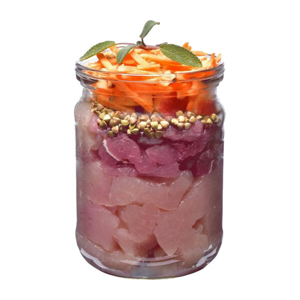 48% курка, 28% індик, 11% бульйон, 4,5% батат, 2% яблука, 2% мінерали, 1,3% гречка, 1% суміш трав (розмарин, чебрець, календула, кульбаба), 1% лососева олія, 0,5% петрушка, 0,5% насіння льону, 0,2% водорості та чорна смородина.