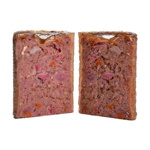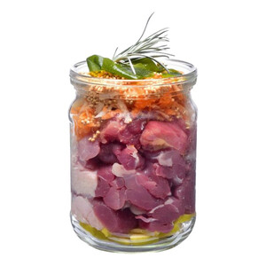 66% качка, 14% бульйон, 8% просо, 4,3% морква, 2% яблука, 2% мінерали, 1% суміш трав (розмарин, чебрець, календула, кульбаба), 1% лососева олія, 1% петрушка, 0,5% насіння льону, 0,2% водорості та чорна смородина.