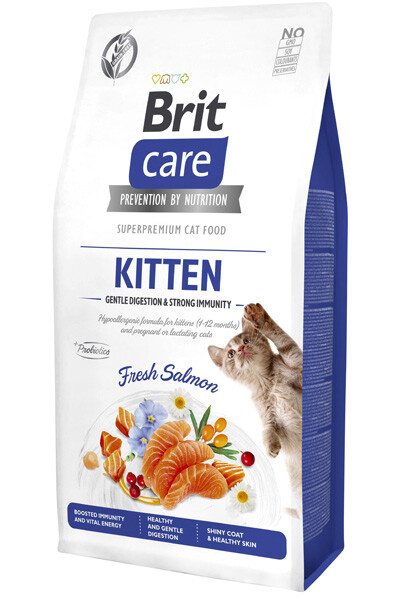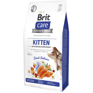 Повнораціонний корм Brit Care GF Kitten Gentle Digestion and Strong Immunity суперпреміум класу зі свіжим лососем для кошенят (1–12 місяців), а також для вагітних або годуючих кішок.