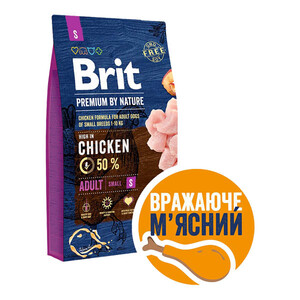 Brit Premium by Nature - повнораціонний сухий корм для дорослих собак дрібних порід. Оновлена лінійка кормів Brit Premium by Nature містить збільшений вміст протеїнів тваринного походження. До складу входить 50% м'яса курки, яке забезпечує організм собаки необхідними білками для підтримки м'язової маси. Корм не містить ГМО та штучних підсилювачів смаку, що гарантує відмінні смакові якості.
