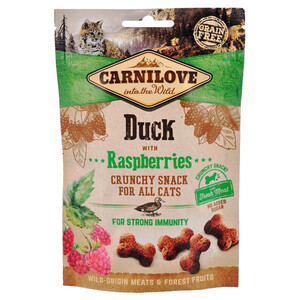 Ласощі Carnilove для котів Crunchy Snack з качкою та малиною, 50 г — це вишукані беззернові ласощі для котів, створені на основі качки та малини. Хрусткі снеки не лише тішать улюбленця насиченим смаком, а й сприяють підтримці імунної системи завдяки натуральним інгредієнтам та антиоксидантам.