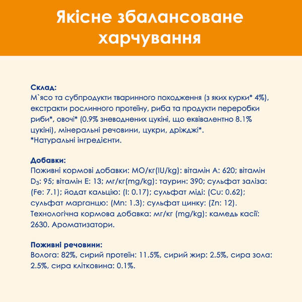 м’ясо та субпродукти тваринного походження (зокрема 4% курка), екстракти рослинного протеїну, риба та продукти перероблення риби, овочі (0.8% дегідратованих цукіні, що еквівалентно 7% відновлених цукіні), мінеральні речовини, цукор, дріжджі.
