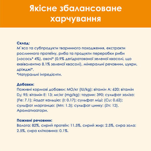 м’ясо та субпродукти тваринного походження, екстракти рослинного протеїну, риба та продукти перероблення риби (зокрема 4 % лосось), овочі (0,9 % дегідратованої зеленої квасолі, що еквівалентно 8,1% відновленої зеленої квасолі), мінеральні речовини, цукор, дріжджі.