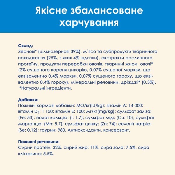 зернові (цільнозернові 39%), м`ясо та субпродукти тваринного походження (25%, з яких індички 4%), екстракти рослинного протеїну, рослинні олії та тваринні жири, продукти переробки овочів, овочі (2% сушеного кореня цикорію, 0.07% сушеної моркви, що еквівалентно 0.4% моркви, 0.07% сушеного гороху, що еквівалентно 0.4% гороху), мінеральні речовини, дріжджі (0,3%).