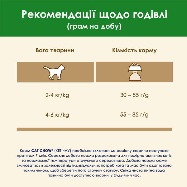 Корм Cat Chow створений для профілактики сечокам'яної хвороби та підтримання нормальної ваги у кастрованих і стерилізованих котів та кішок.