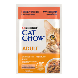 Вологий корм для дорослих котів Cat Chow Adult, ніжні шматочки в желе (яловичина та баклажан)