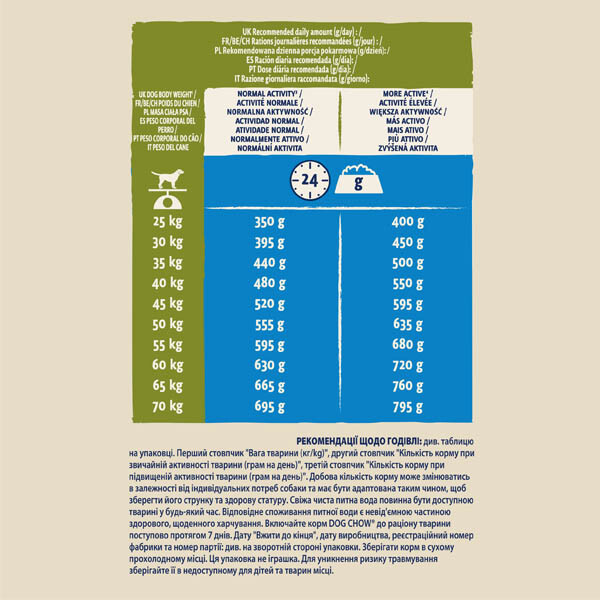 Собаки великих порід завжди енергійні – вони бігають, охороняють та виконують свої обов'язки. Для підтримки цієї активності їм потрібне спеціально збалансоване харчування. Dog Chow® створено з урахуванням цих потреб, з додаванням амінокислот для підтримки життєво важливих функцій організму, а також омега-3 жирних кислот для здоров'я суглобів. Натуральні інгредієнти, включаючи цикорій із пребіотичними властивостями, підтримують здорове травлення.