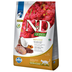 Farmina N&D Cat Grain Free Quinoa Skin & Coat Quail - беззерновий сухий корм для дорослих кішок усіх порід, схильних до захворювань шкіри та шерсті, з перепелом, кокосом і куркумою.