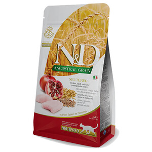Farmina N&D Low Grain Neutered Chicken & Pomegranate – це повноцінний раціон, спеціально розроблений для стерилізованих котів. Корм містить високий рівень білка та L-карнітин, що сприяє підтримці м’язової маси та правильному використанню жирів, запобігаючи ожирінню. Низький рівень крохмалю та цукру допомагає контролювати рівень глюкози в крові, знижуючи ризик розвитку переддіабетичних станів.
