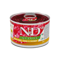 Farmina N&D Adult Mini Quinoa Skin&Coat - повнораціонний вологий корм з перепілкою та кокосом для дорослих собак мініатюрних і малих порід, схильних до харчової алергії. Смачна та поживна страва, що може використовуватись як основний раціон або доповнення до нього.