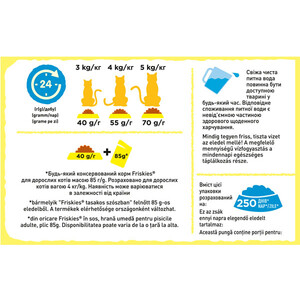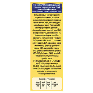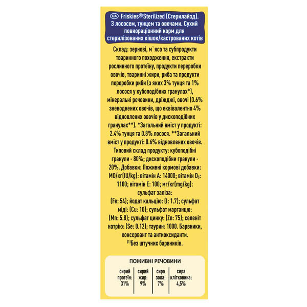 Friskies для стерилізованих котів – це 100% повнораціонний та збалансований корм, розроблений для підтримки здоров'я вашого улюбленця. Збалансований вміст білків та жирів допомагає вашому котові підтримувати оптимальну вагу. Крім того, корм містить комплекс вітамінів та мінеральних речовин для підтримки здоров'я сечової системи та природного захисту вашого котика. Friskies для стерилізованих кішок і кастрованих котів допомагає вашому улюбленцю бути здоровим, бадьорим і щасливим, наповнюючи вашу домівку радістю щодня!