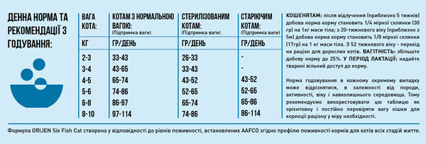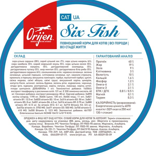 ORIJEN Six Fish Cat відтворює харчування предків котів, забезпечуючи вашого вихованця необхідними нутрієнтами для оптимального здоров’я і життєвих сил.