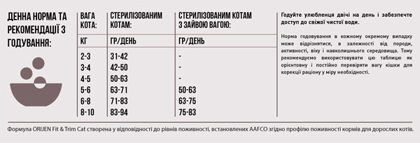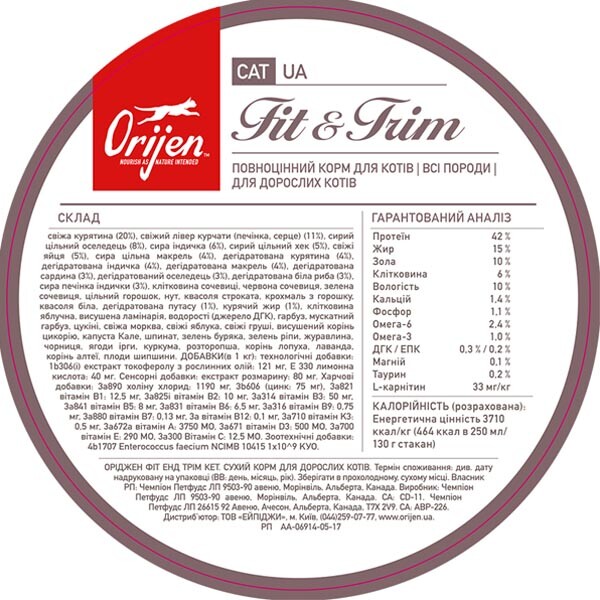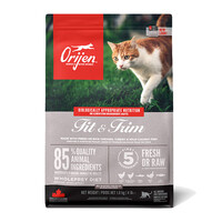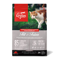 Orijen Fit and Trim спеціально розроблений для котів із зайвою вагою, забезпечуючи оптимальне харчування з високим вмістом протеїнів (44%) і низьким рівнем вуглеводів (15%), відповідно до їх біологічних потреб.