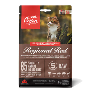 Приготований в Канаді з відбірних інгредієнтів, ORIJEN Regional Red підтримує розвиток і здоров'я вашої кішки завдяки багатому та смачному складу.