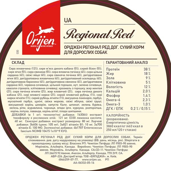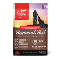 Корм ORIJEN Regional Red створений для підтримки оптимального здоров'я та активності собак. Завдяки рецептурі, багатій на якісні м’ясні інгредієнти, цей корм задовольняє природні потреби м’ясоїдних тварин, забезпечуючи їх важливими протеїнами, нутрієнтами, вітамінами та мінералами. Раціон містить 85% м’ясних інгредієнтів від різних джерел, таких як м’ясо бичків, дикого кабана, бізона, ягняти та свинини.