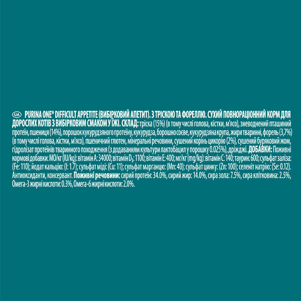 Сухий повнораціонний корм для дорослих котів з вибірковим смаком у їжі PURINA ONE DIFFICULT APPETITE (тріска та форель)