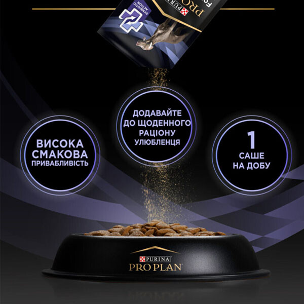 PURINA PRO PLAN FortiFlora PLUS - додатковий корм для дорослих собак та цуценят (після відлучення від матері) із синбіотичною дією пребіотика та пробіотика. Cприяє підтримці здорового мікробіому, його балансу та зміцненню імунного захисту. Кожне саше містить гарантований рівень пробіотичних бактерій в поєднанні з пребіотиком рослинного походження.