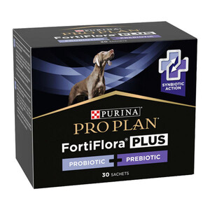 PURINA PRO PLAN FortiFlora PLUS - додатковий корм для дорослих собак та цуценят (після відлучення від матері) із синбіотичною дією пребіотика та пробіотика. Cприяє підтримці здорового мікробіому, його балансу та зміцненню імунного захисту. Кожне саше містить гарантований рівень пробіотичних бактерій в поєднанні з пребіотиком рослинного походження.