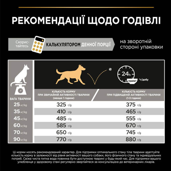 Рекомендації щодо годівлі дивіться на упаковці (у грамах на добу). Враховуйте вагу та активність вашого собаки. Забезпечуйте тварину свіжою водою в будь-який час. Щоб підтримувати здоров'я собаки, регулярно звертайтесь до ветеринарного лікаря.