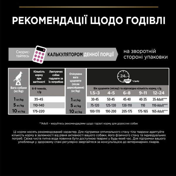 Використовуйте таблицю на упаковці для визначення добової норми корму, залежно від ваги, активності та фізичного стану цуценяти. Корм вводьте поступово під час відлучення від молока. Обов'язково забезпечте доступ до чистої питної води. Регулярно звертайтесь за консультацією до ветеринарного лікаря для контролю здоров'я вашого цуценяти.