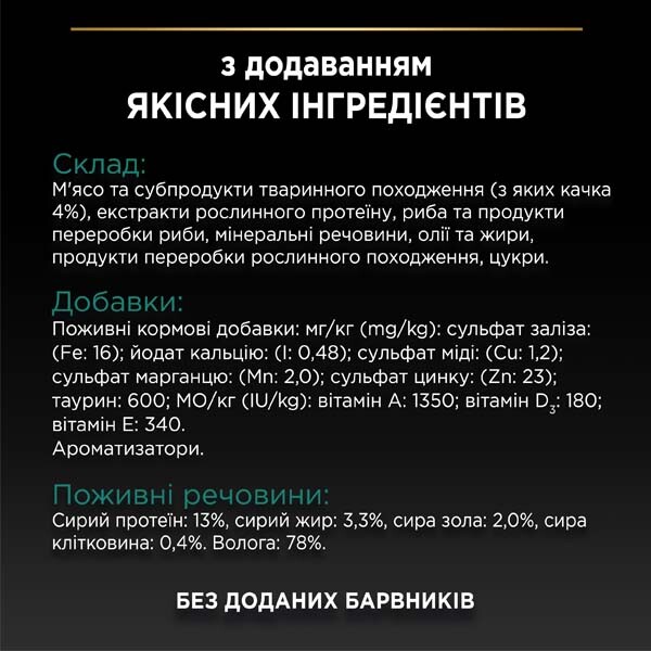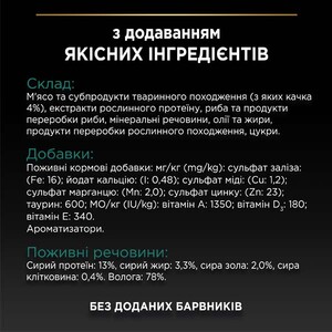 М'ясо та субпродукти тваринного походження, риба та продукти переробки риби (з яких океанічна риба 4%), продукти переробки рослинного походження, мінеральні речовини, цукри.