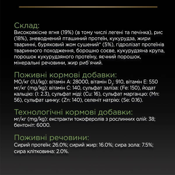 високоякісне ягня (19%, в тому числі легені та печінка), пшениця, зневоднений пташиний протеїн, кукурудза, рис 18%, тваринні жири, сушений буряковий жом (5%), гідролізат протеїнів тваринного походження, борошно соєве, порошок кукурудзяного протеїну, пшеничний глютен, мінеральні речовини, яєчний порошок, риб'ячий жир. Технологічні кормові добавки: екстракти токоферолів з олії: 38 мг/кг.