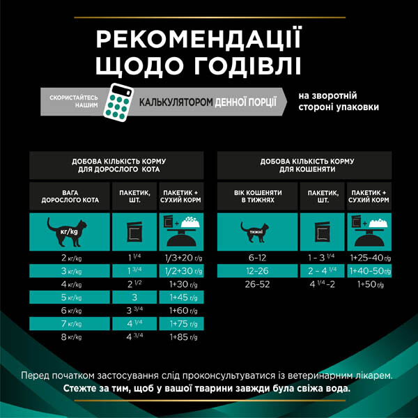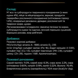 Корм випускається у вигляді ніжних шматочків у ароматній підливі, що сприяє кращому апетиту. Рекомендоване дозування потрібно коригувати відповідно до таблиці годування і під наглядом ветеринара.