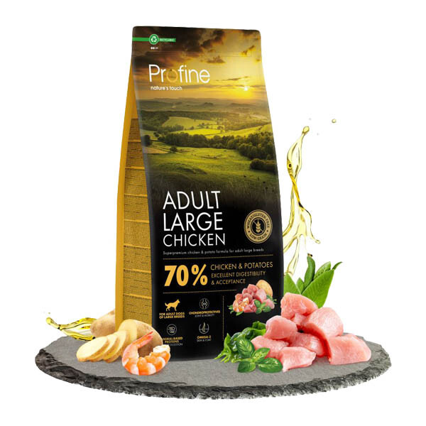 Profine Adult Large Breed Chicken — це сухий корм суперпреміум класу, спеціально створений для дорослих собак великих порід (вагою від 25 кг). Завдяки високому вмісту курятини (40%), корм сприяє відмінній засвоюваності, забезпечує енергію та здоровий розвиток. Хондропротектори та мінерали підтримують здоров'я суглобів і скелета, а спеціальні добавки покращують травлення та імунітет.