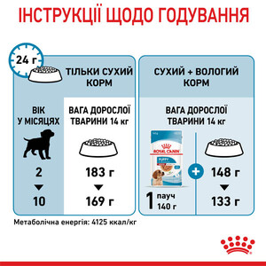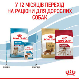 Повнораціонний сухий корм Royal Canin Medium Puppy для собак середніх розмірів. Вага дорослої тварини від 11 до 25 кг, віком від 2 до 12 місяців.