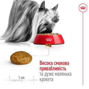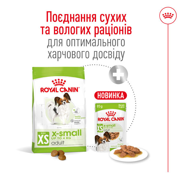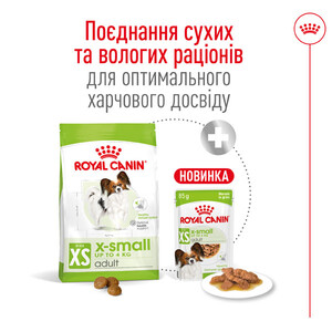 Сухий корм Royal Canin X-Small Adult для дорослих собак мініатюрних порід віком від 10 місяців до 8 років забезпечує оптимальний рівень енергії для активного життя. Спеціально розроблена формула підтримує здорове травлення та зберігає баланс мікрофлори кишківника. Додані інгредієнти сприяють блиску шерсті та захищають шкіру, забезпечуючи її здоров'я. Корм також підтримує функції сечовидільної системи, надаючи надійний захист. Завдяки високій смаковій привабливості і маленькому розміру крокет, корм ідеально підходить для собак мініатюрних порід, забезпечуючи їм комфортне харчування.