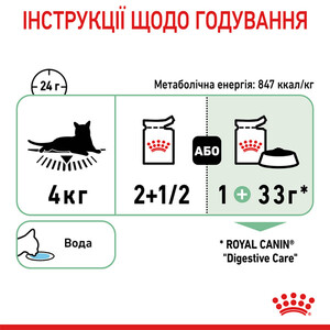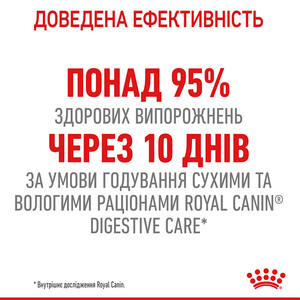 - Доведена ефективність: понад 95% здорових випорожнень через 10 днів* за умови годування сухими та вологими раціонами Royal Canin Digestive Care.