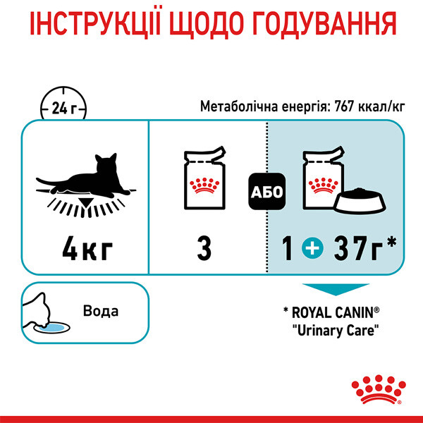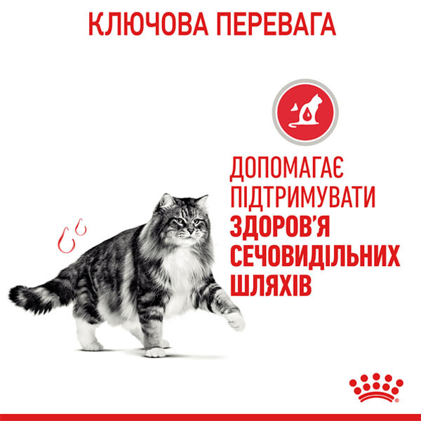 - Доведена ефективність: за 10 днів сприяє підтриманню здоров’я сечовивідних шляхів у здорових котів, яких годували сухими та вологими раціонами ROYAL CANIN® URINARY CARE*.