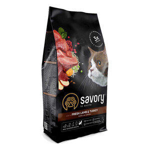 Savory Adult Cat Sensitive Digestion Fresh Lamb & Turkey - збалансований низькозерновий сухий корм на основі свіжого м'яса ягняти та індички для дорослих котів з чутливим травленням. Цей корм містить добірні натуральні інгредієнти, які допомагають піклуватися про здоров’я кота та забезпечують йому насолоду від щоденного споживання корму Savory.