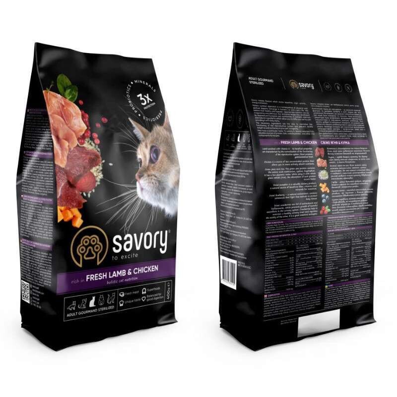 Сухий корм Savory Fresh Lamb & Chicken класу холістик для дорослих кастрованих/стерилізованих котів і кішок має ексклюзивну рецептуру, розроблену досвідченими європейськими фахівцями з харчування домашніх улюбленців. Корм враховує всі потреби організму кастрованих та стерилізованих котів, забезпечуючи їх здоров'я і підтримуючи оптимальну вагу.
