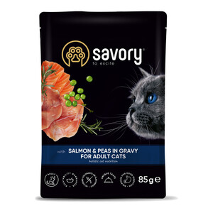 Вологий корм для дорослих котів будь-яких порід від відомого бренду Savory має у складі м'ясо та рибу, зокрема лосось, який викликає абсолютну зацікавленість у більшості котів. Лосось є дієтичним м'ясом, що не лише корисне, але й легко засвоюється, не перевантажує травну систему, покращує стан шкіри та шерсті. Зелений горошок у складі забезпечує корисну м'яку клітковину, сприяючи почуттю ситості та оптимальному травленню.