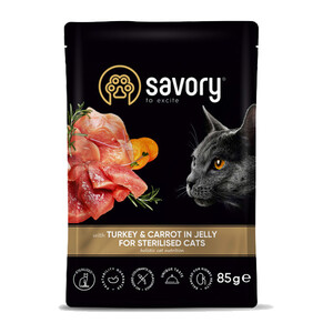 З віком стерилізовані тварини схильні до набору ваги. Склад вологого корму Savory спеціально розроблений для котів, дозволяючи підтримувати м'язову масу без надлишкової ваги. Завдяки ніжній текстурі м'ясних шматочків паучі підходять і для тварин похилого віку, які із задоволенням будуть ласувати частуванням з індичкою та морквою в желе. Корм з індичкою добре засвоюється, не перевантажуючи травну систему, а морква забезпечує хороше травлення й оптимальну роботу кишківника.