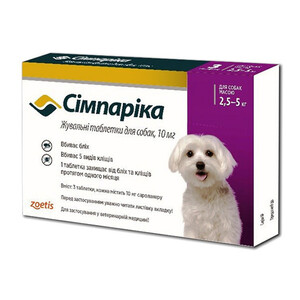 Симпаріка - інсектоакарицидний лікарський засіб системної дії для собак вагою від 2,5 до 5 кг. Має приємний для улюбленця смак печінки. Діюча речовина - сароланер.