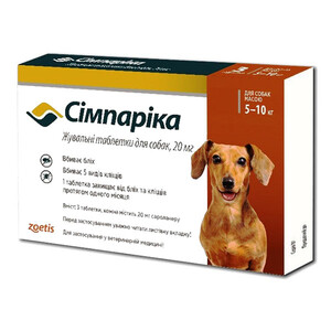 Симпаріка - інсектоакарицидний лікарський засіб системної дії для собак вагою від 5 до 10 кг. Має приємний для улюбленця смак печінки. Діюча речовина - сароланер.