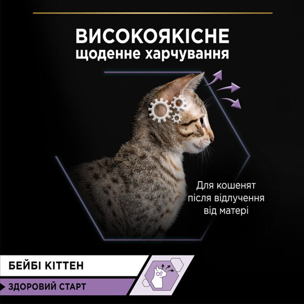 - Розвиток здорового мозку та зору: омега-3 з риб'ячого жиру та ДГК (докозагексаєнова кислота) сприяють розвитку мозку і зору кошеня.